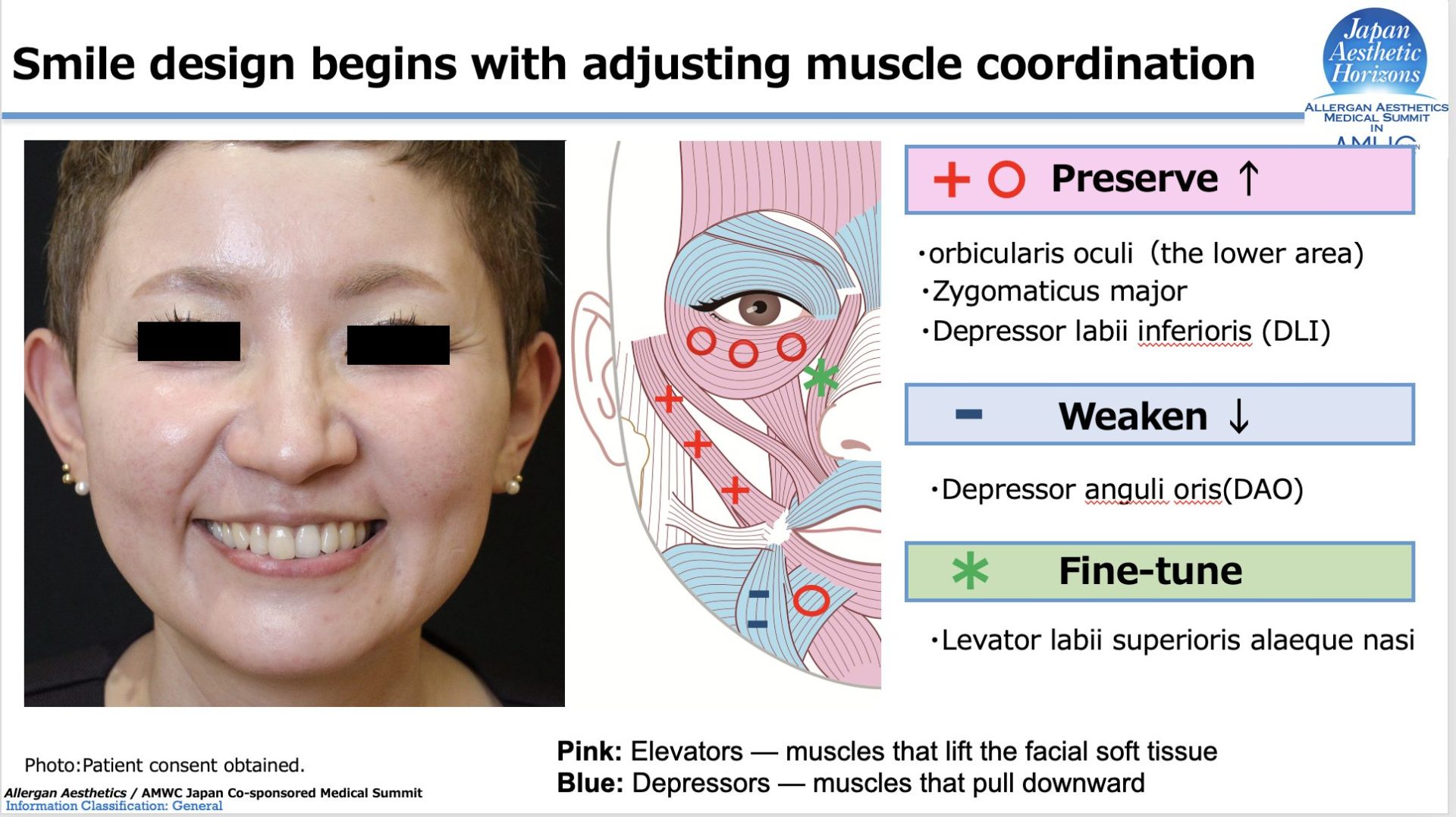 私はこの「筋肉のバランスの調律(Tuning)」を重視しています。表情筋の協調関係を理解し、“どの筋肉をどの程度弱め、どの筋肉を残すか”をデザインすることで、自然で美しい笑顔を引き出すことができます。