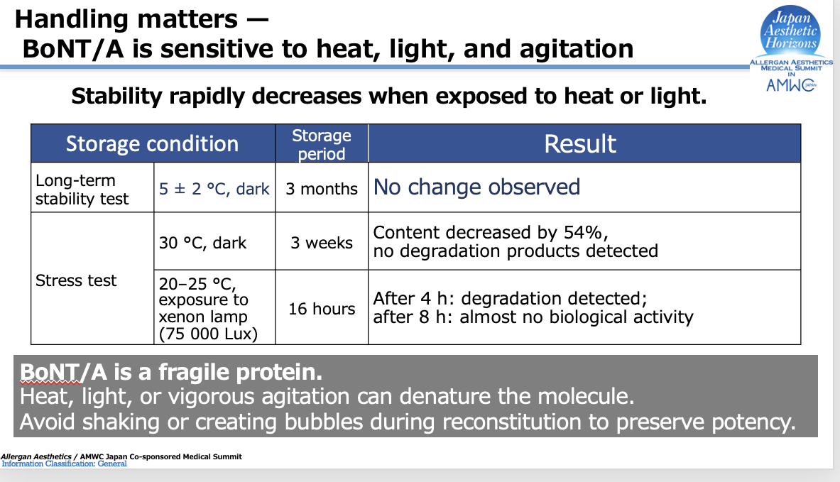ボツリヌストキシンは、非常に繊細な蛋白質で、保存状態や調整時の取り扱いによって構造が変化するため、正しい取り扱いが必要です。また、他剤との混合によってpHが変わると構造が変化するだけでなく、活性にも影響がある可能性もあるため、むやみに色々な製剤と混合することは推奨できません。