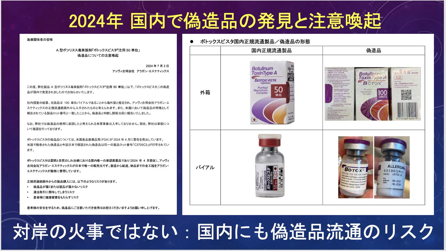 2024年には米国FDAから「美容目的の治療後にボツリヌス症が多発した」との緊急アラートが出されました。 入院を要する重篤な被害の背景には、粗悪な未承認製剤や偽造品の流通があります。 日本国内でも偽造品が発見されており、製剤の「出所」の確認は医師の最低限の責務です。