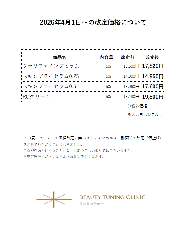 【ゼオスキンヘルス商品】2026年4月1日~の価格改定について by Beauty Tuning Clinic -美容調律診療所- in お知らせ 3月 18, 2026 この度、メーカーの価格改定に伴いゼオスキンヘルス一部商品の価格改定(値上げ)をさ… Read More