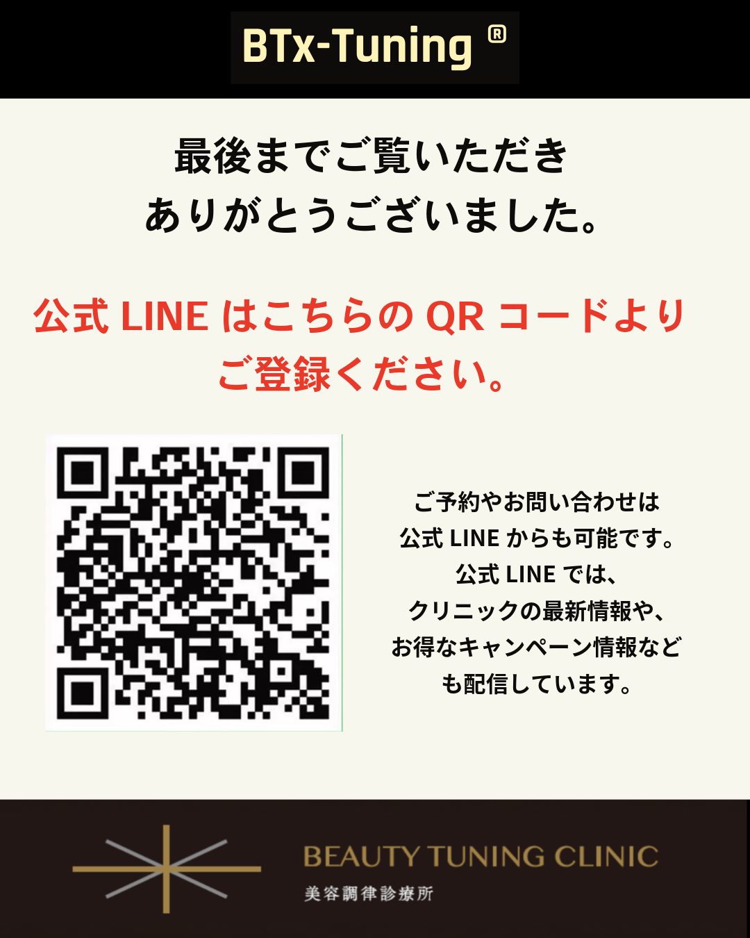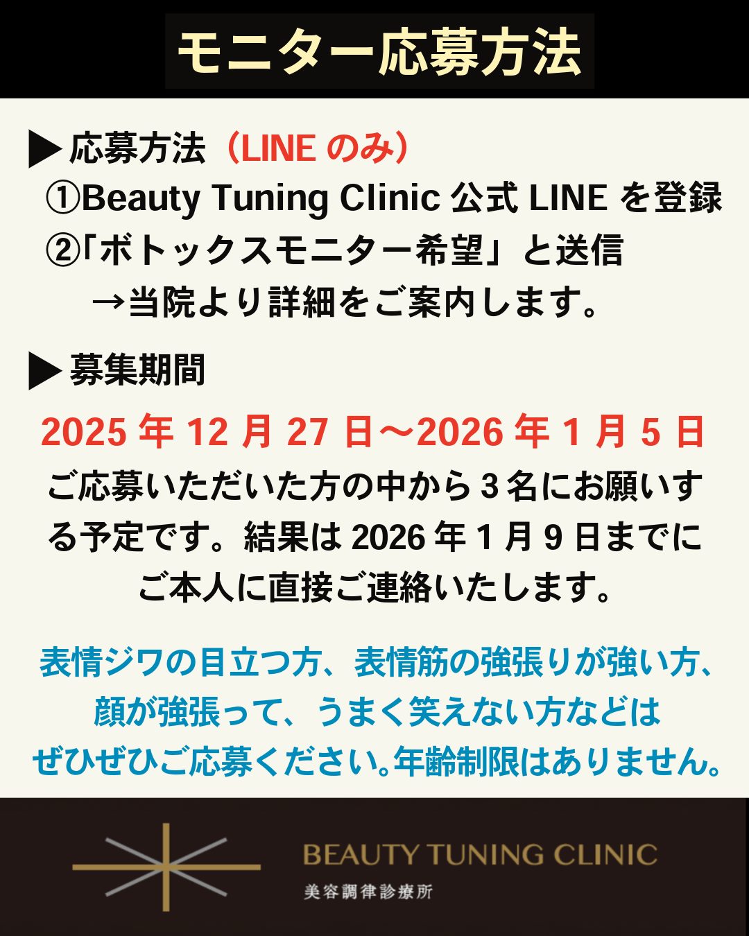 応募先: 当院公式LINEを友だち追加し、「ボトックスモニター希望」とメッセージを送信してください 。もしくは、ご来院時にスタッフにお尋ねください。本モニターについてのご質問は、お電話では対応しておりません。
