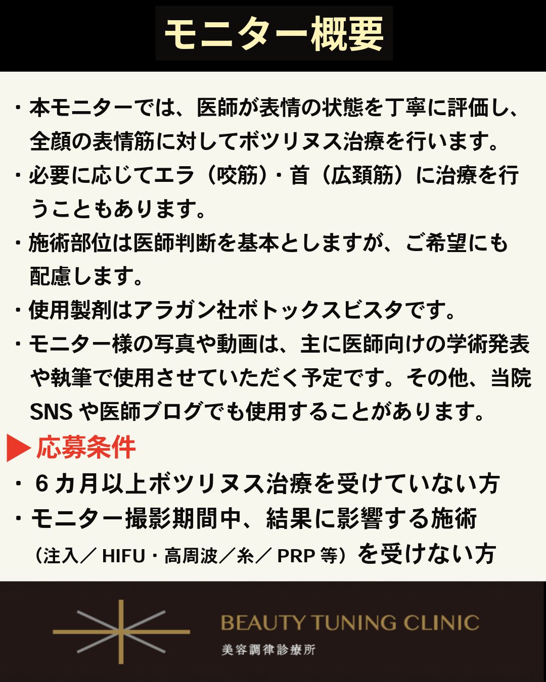 モニター期間中(2026年3月末まで)、結果に影響する他の注入治療やたるみ治療(ヒアルロン酸、糸リフト、HIFUなど)を受けない方。まつ毛のエクステやパーマ、目周りの手術も期間中は避けてください。