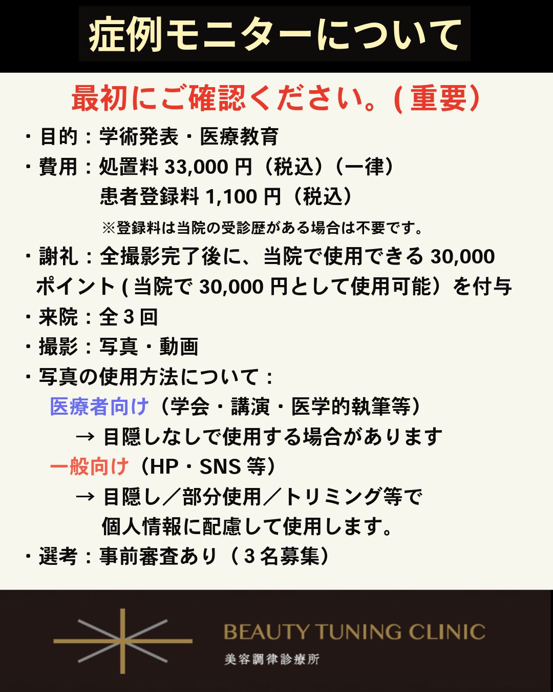 規定の期間内に全3回来院し、写真・動画撮影およびその使用にご同意いただける方 。