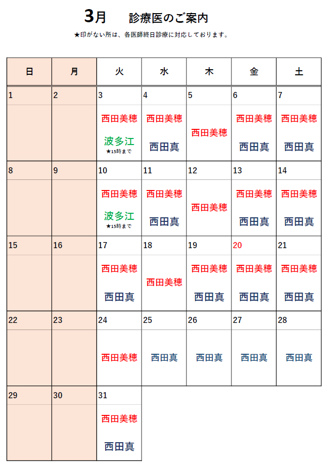 西田美穂医師は不在となります。