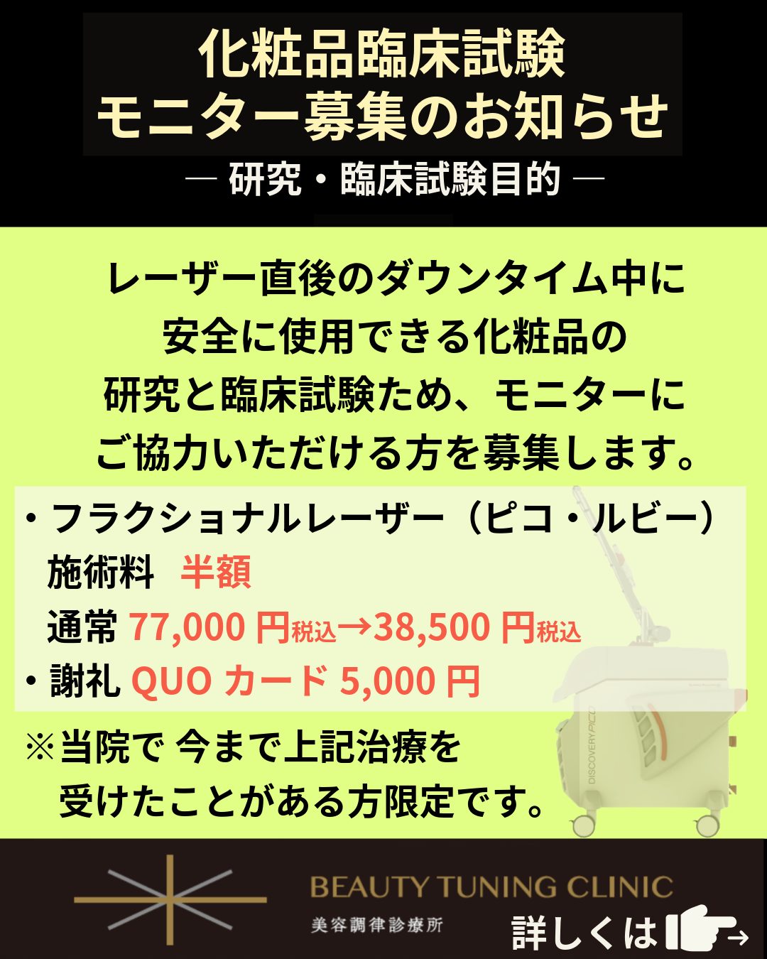 レーザー後のダウンタイムをどう過ごすか、というのは実は臨床的にまだ答えが定まっていない部分で、今回の試験はそこに一つの科学的な根拠を作っていく試みです。「ちょうどレーザーを考えていた」「ダウンタイムのケアが気になっていた」という方には、参加の意義もあるかなと思います。