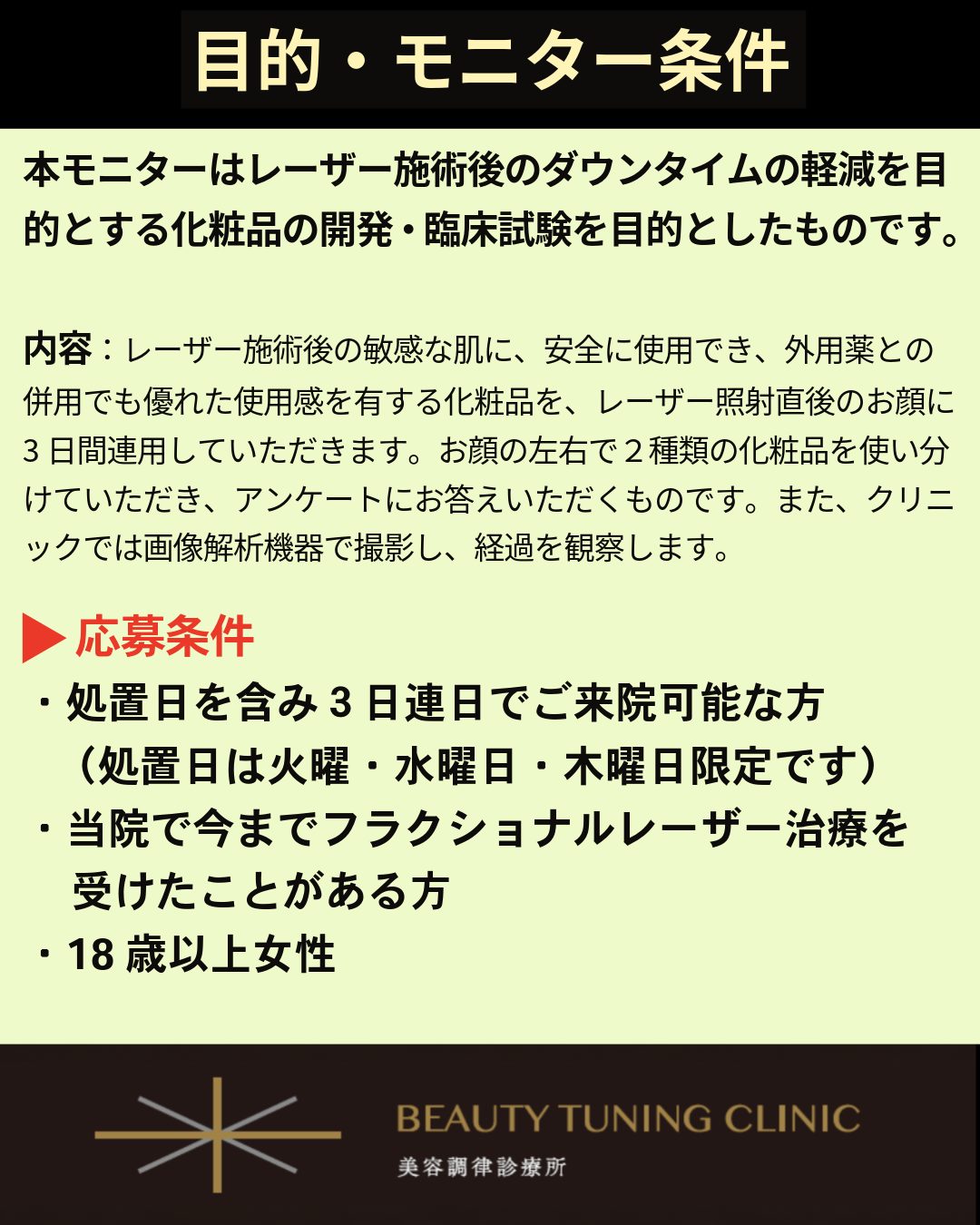 化粧品の臨床試験、それも「レーザー直後のダウンタイム中に安全に使える化粧品」を開発するための試験に、モニターとしてご協力いただける方を募集しています。