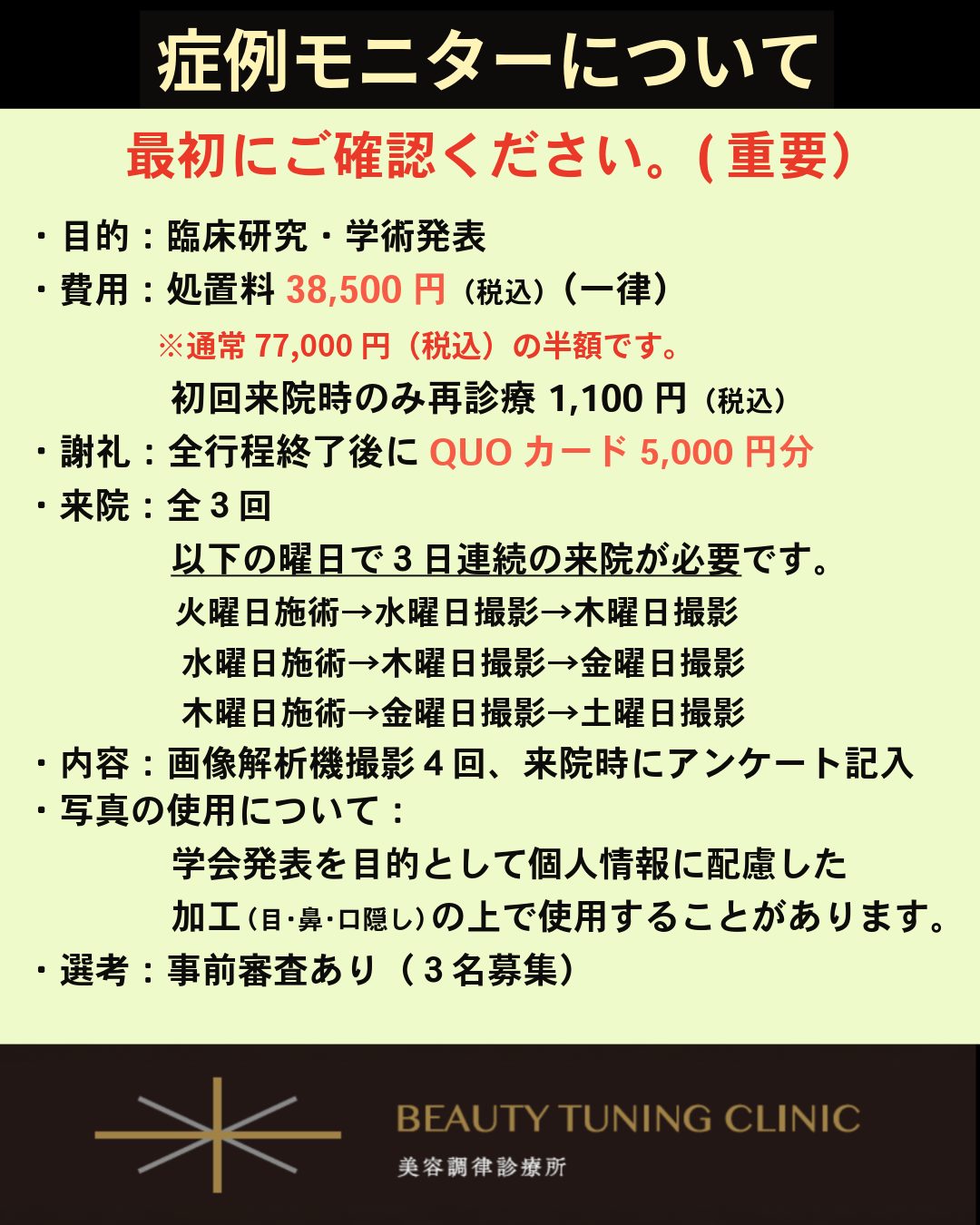 - 処置日を含む3日連続で来院可能な方(処置日は火曜・水曜・木曜に限定)