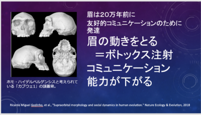 眉の動きはコミュニケーションに大変重要で、20万年前から友好的コミュニケーションの手段として、我々のは眉の動きを発達させてきました。と、ネイチャーに書いてあります。また、この論文では、眉毛の動きを止めるボトックス注射にはコミュニケーション能力を下げる可能性がある、とまで示唆されています。
