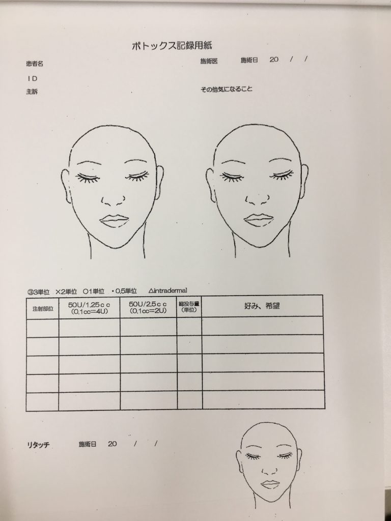 この部位別メニューは1か月の保証付きです。ボトックス施術後2~4週間後にご来院いただいて、効果を見ながら、適宜追加しています。ボトックスの効き具合やお好みは人それぞれであるため、当院では、その人ごとにオーダーメイドの打ち方を行っています。また、どのくらいの量のボトックスをどの層にどう打ったか、ということを、その方ごとに記録することで、どんどんその方のご希望に添うよう努力しています。