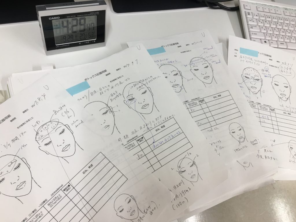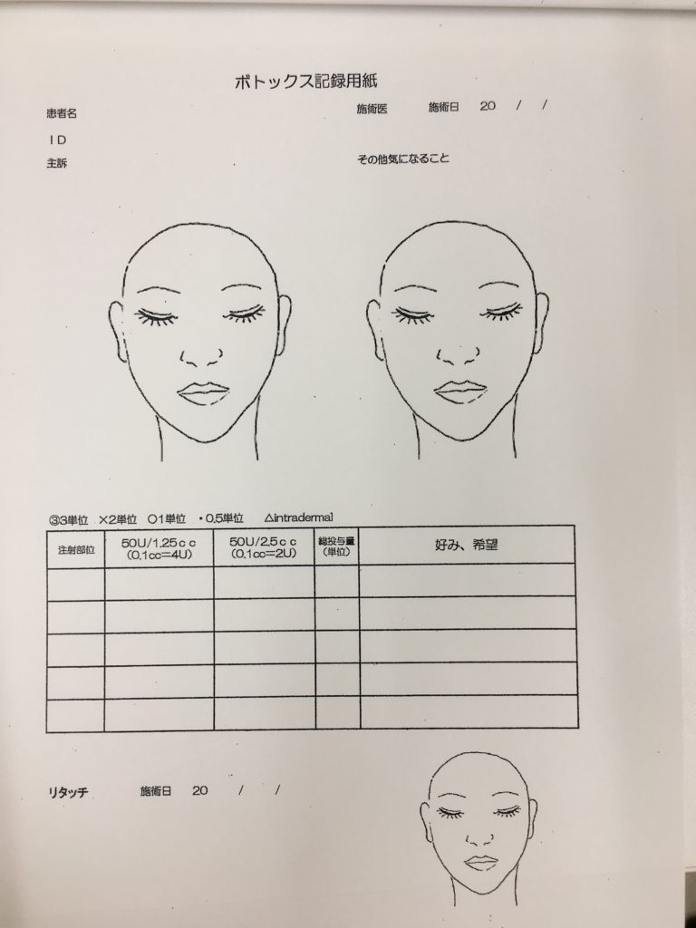 私は、ボトックスを行う全ての方について、毎回患者さんの写真(静止時、表情筋最大緊張時)と共に、自作の上記用紙に施術量・方法を全て記録しています。