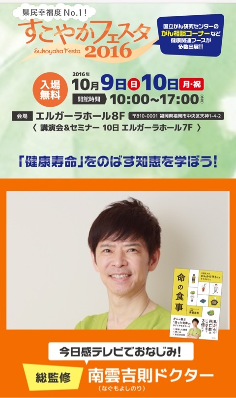Posted on 16 9月 2016 / 0 Comment / Beauty Tuning Clinic -美容調律診療所-すこやかフェスタ2016in福岡福岡エルガーラホールにて、すこやかフェスタ2016が開催されます。10月10日には「健康寿命」についての講演会が行われ、南雲先生と森下先生による対談や、福岡大学形成外科の大慈弥教授による眼瞼下垂のご講演もあります。私も、ちょこっと、「シミ・シワ・たるみ」についてお話ししますよ。参加は無料ですが、事前申し込みが必要です。申込み、問合せは、西日本リビング新聞社(092-733-0535・10:00~19:00土日祝日除く)までお願いいたします。ぜひ、ご参加ください(^o^)/詳しくは博多駅クリニックニュースもしくはすこやかフェスタHPでご覧くださいませ見寺絢子クリニック西田美穂もし宜しければクリックをお願いします。いつも、応援ありがとうございます。 美容皮膚科 ブログランキングへ ブログ, 日常2)講演・セミナー講師・執筆論文・教科書・専門医, 日常8)博多駅クリニック