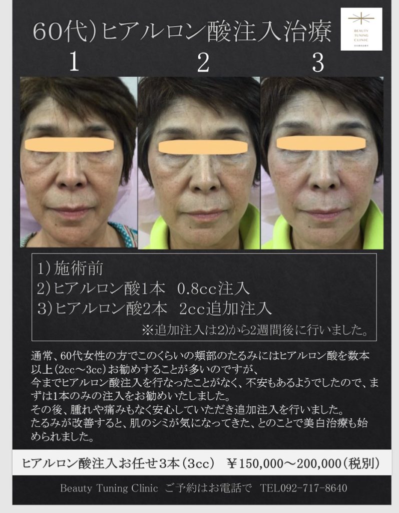 通常、60代女性の方でこのくらいの頬部のたるみにはヒアルロン酸を数本以上(2cc~3cc)お勧めすることが多いのですが、