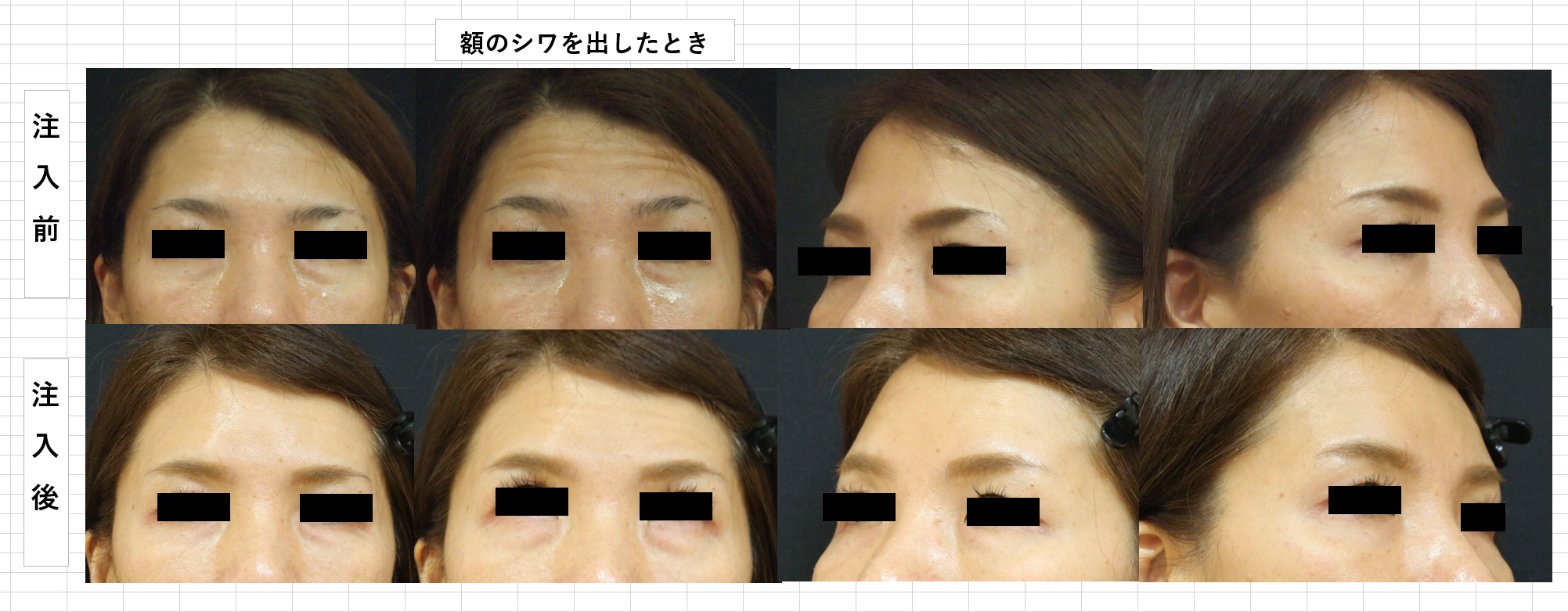 特に本症例のように眉毛の上の骨(眉弓)のハリだしがあり、額の丸みが少ないタイプの方では、ヒアルロン酸を注入することで額の形が滑らかになります。これにより女性らしさが増すだけでなく、シワも出づらくなります。