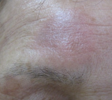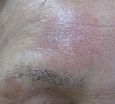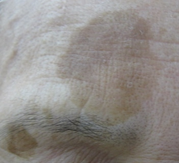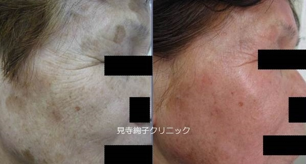 左の眉毛の上下に比較的大きな老人性色素斑、あとは顔全体に散在する色素斑を認め、肌の張りも全体的に低下して小じわの目立つ状態であったため、