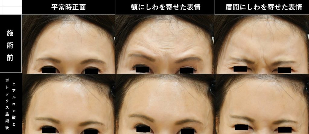 本症例では、額と眉間のシワにボトックスとヒアルロン酸注入治療をいたしました。