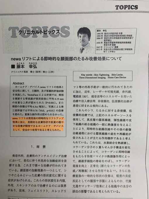 「NEWAリフトは使用後の即時的なリフトアップ効果に加え、長期的な皮膚形状や肌質の穏やかな改善が期待できるホームケア・デバイスとして、安全かつ有用であると考えられた」 クリニックF院長 藤本幸弘先生